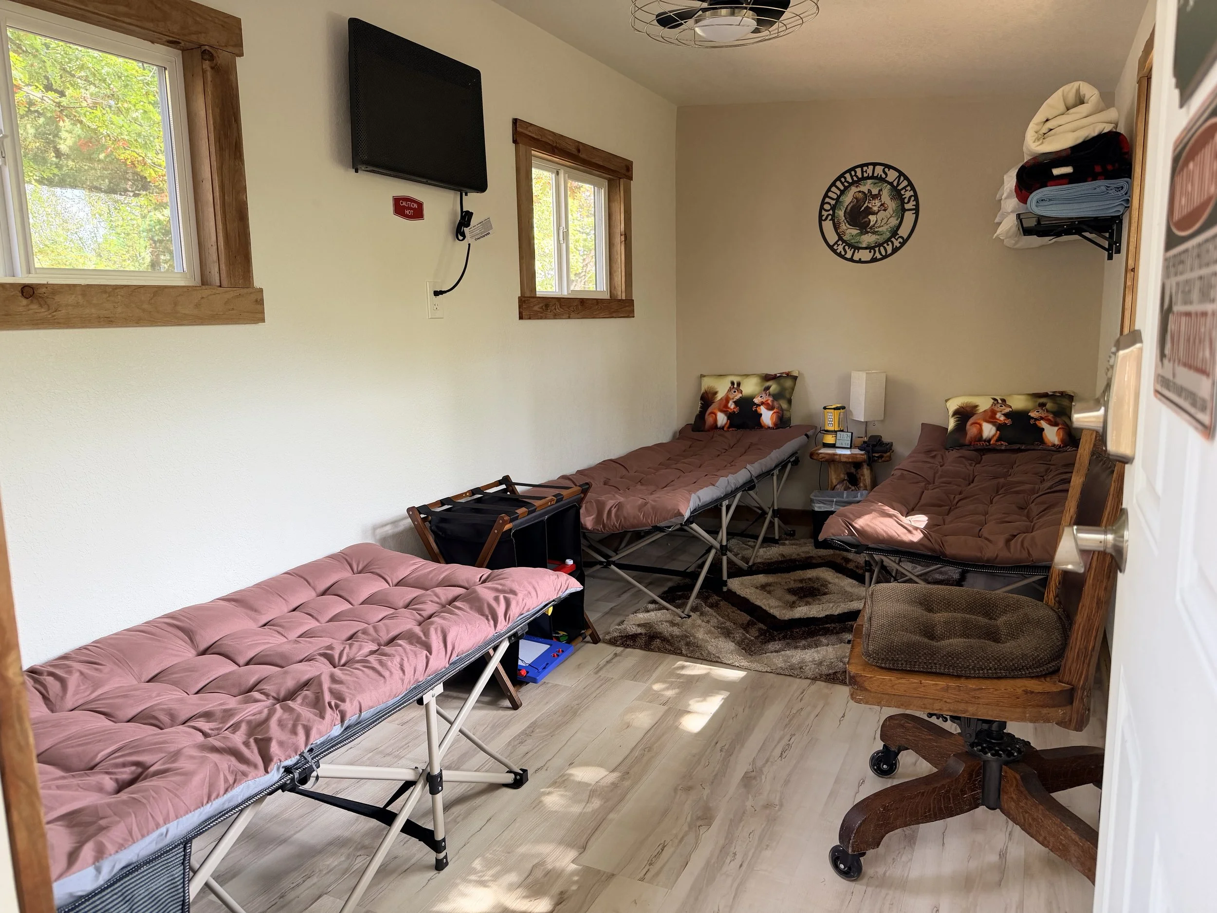 Includes 3 cots. Bring your own sleeping bag (recommended). Blankets & pillows provided.